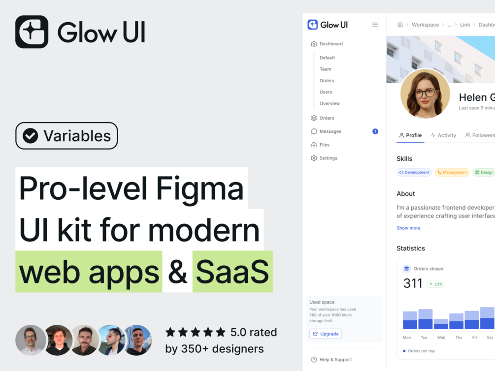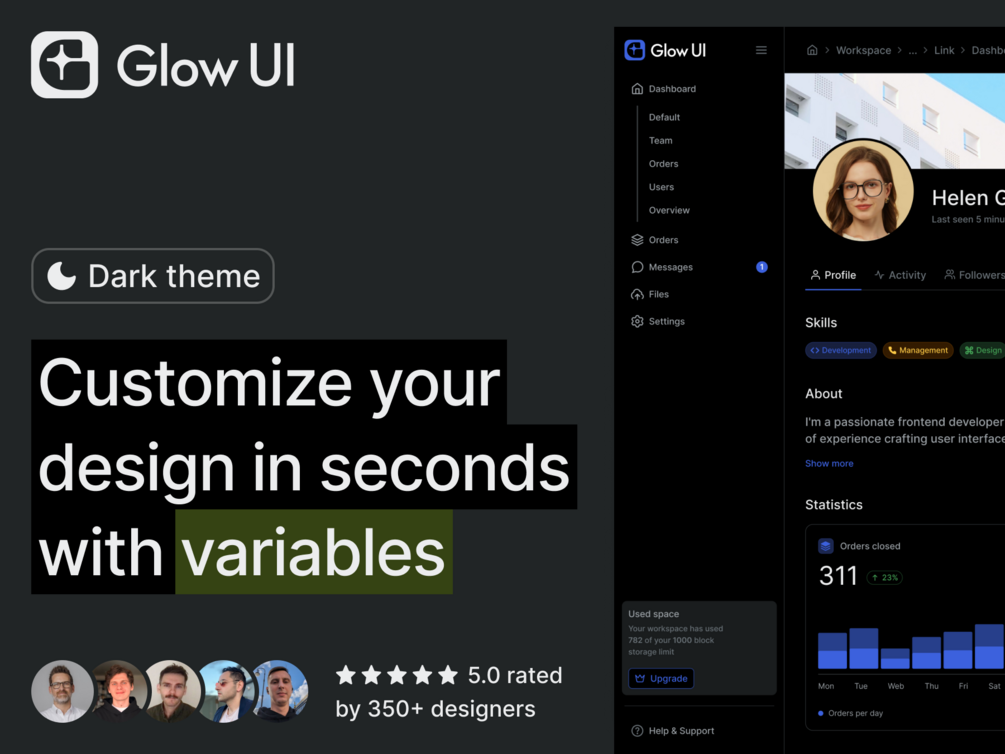 Deep customisation in seconds. 100% of Glow UI components are covered by variables, typography, and effects styles. Change one variables or style and apply changes to the entire library!
